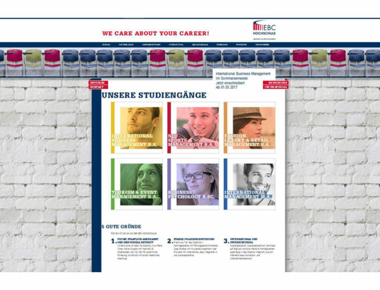 Pünktlich zum Semesterstart ging zudem das neue Corporate Design der EBC Hochschule online. In klar voneinander unterscheidbaren frischen Farben stellen sich nun die Studiengänge auf Webseite und in den Broschüren vor, in modernen Schriftarten werden seit Anfang Oktober klar verständliche Botschaften auf Augenhöhe mit den Studierenden vermittelt. Marketingleiter Heiko Delventhal: „Wir wollten unseren Anspruch „Studieren mit Wir-Gefühl“ besser vermitteln können und unseren künftigen Studierenden deutlich machen, dass wir ihre Erwartungen an ein Studium an der EBC Hochschule ernst nehmen und mit ihnen auf einer Ebene kommunizieren.“