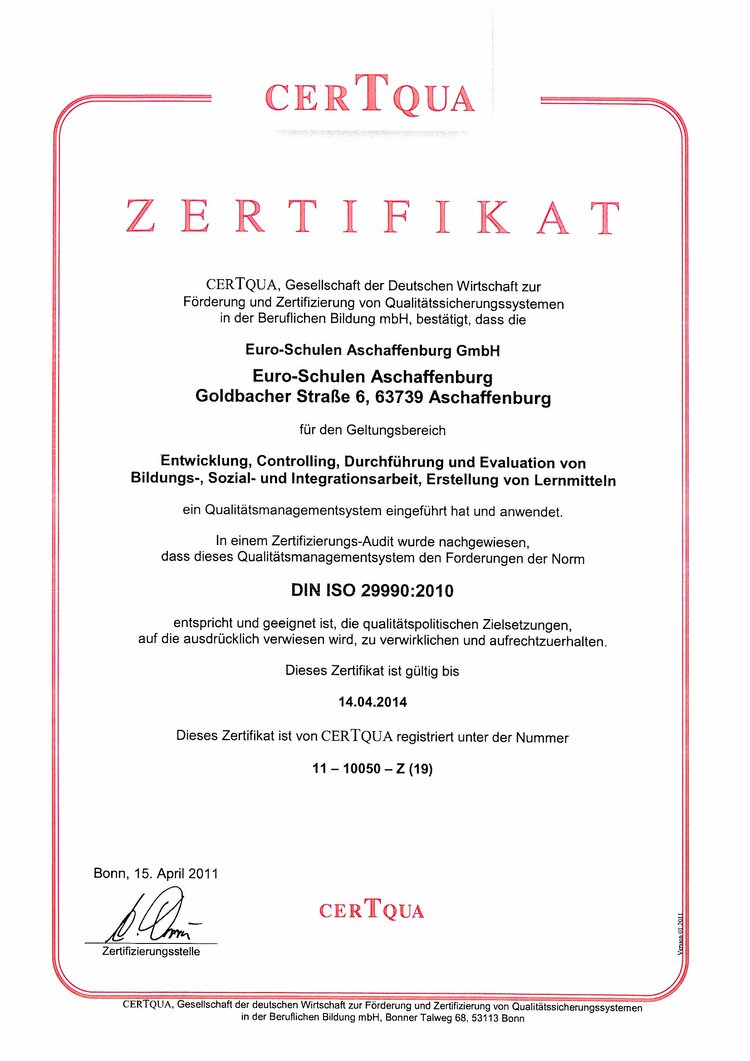 Die Qualität der Bildung nach der Norm DIN ISO 29990 wurde ESO jetzt als erstem Bildungsträger bundesweit von CERTQUA, der Gesellschaft der Deutschen Wirtschaft zur Förderung von Qualitätssicherungssystemen in der Beruflichen Bildung, bestätigt.