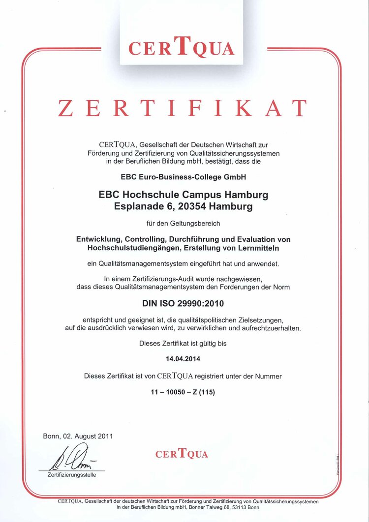 Als weltweit eine der ersten Hochschulen wurde die EBC Hochschule als Bildungsträger nach der neuen Norm DIN ISO 29990 zertifiziert. Zeitgleich erhielt sie die Zertifizierung nach DIN EN ISO 9001. Die EBC Hochschule gehört damit zu einer der wenigen Hochschulen mit einem überprüften Managementsystem nach internationalen Standards. Besonders hervorzuheben ist die Zertifizierung nach DIN ISO 29990, deren Bildungsqualitätsanforderungen nachweislich an der EBC Hochschule umgesetzt werden. Die Norm bezeichnet ein Qualitätsmanagement für die Aus- und Weiterbildung, welches sich auf den Lernprozess fokussiert. Sie garantiert ferner, dass die Hochschule objektiv erkennbare Qualitätssicherung und Transparenz bietet und nachweislich ein Qualitätsmanagement in den Geltungsbereichen Entwicklung, Controlling, Erstellung von Lernmitteln sowie Durchführung und Evaluation von Hochschulstudiengängen eingeführt und angewendet hat.