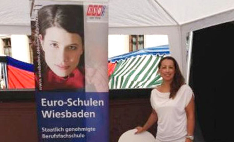 Euro-Schulen Wiesbaden feierten nicht nur mit sondern konnten dort auch über ihre Bildungsangebote informieren. Nada Karacic (siehe Foto) nutzte die Gelegenheit, um viele Interessierte individuell zu beraten. Die Euro-Schulen bieten seit Jahren die Möglichkeit, in vom Bundesamt für Migration geförderten Kursen Deutsch zu lernen oder die vorhandenen Deutschkenntnisse zu verbessern.
