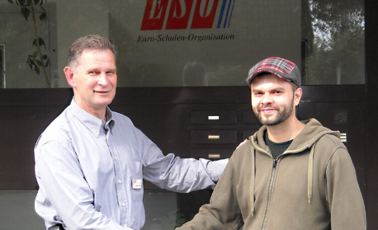 Das Foto zeigt Ruben-Dario Jakobowski (rechts) mit dem Arbeitsvermittler Rüdiger Gaul von den Euro-Schulen.