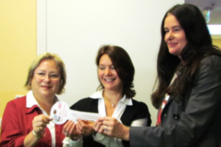 Das Foto zeigt (v.l.) Petra Wust, OB Bitterfeld-Wolfen, Kitaleiterin Simone Hempel, Silvia Semidei (ESO-Geschäftsführerin)
