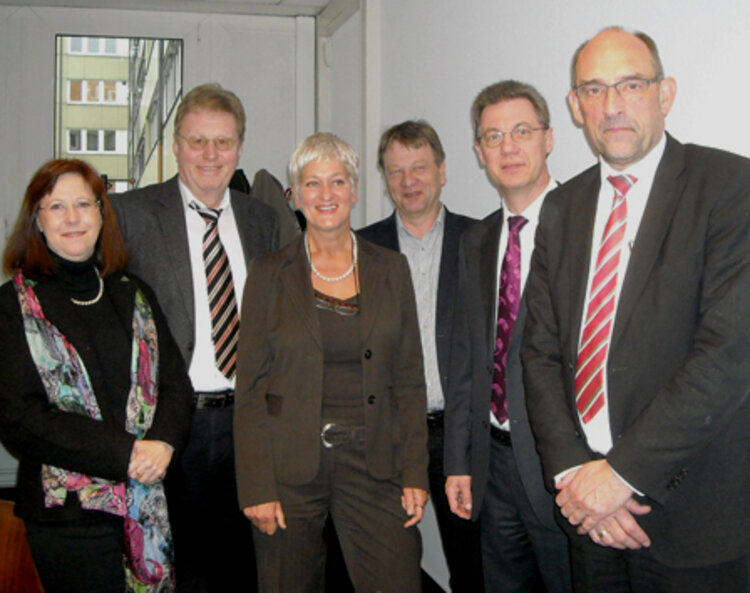 Das Foto zeigt von links nach rechts: Dr. Luise Martens von der HIBB (Hamburger Institut für Berufliche Bildung), Klaus Koch (Bereichsleiter), Astrid Lange (Leiterin HFS), Jürgen Thiel (BASFI Behörde für Arbeit, Soziales, Familie und Integration), Friedhelm Siepe (Geschäftsführer Jobcenter team.arbeit.hamburg), Detlef Scheele (Senator BASFI)