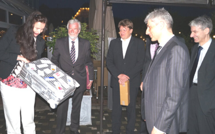 In einer kleinen lockeren Feier überreichte ESO-Geschäftsführerin Silvia Semidei einen Bordkoffer inklusive Ticket „Stockstadt-Jena mit Rückfahrt jederzeit“. Die Geschäftsführer von ESO, den Hochschulen und die Bereichsgeschäftsführer verabschiedeten sich mit Geschenken regionaler Produkte, auch kulinarischer Art, aus den Städten Deutschlands, in denen ESO aktiv ist.