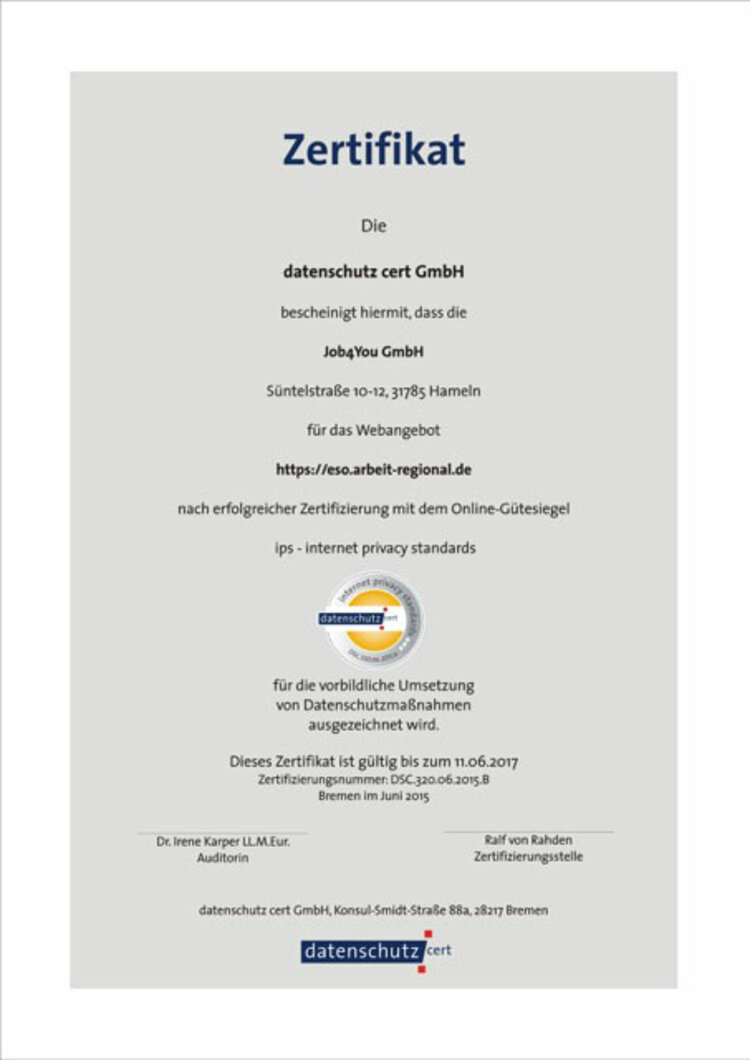 Vor diesem Hintergrund lässt sie die ESO Education Group sein Arbeitsmarktportal regelmäßig nach den internet privacy standards (ips) prüfen und zertifizieren, die als bundesweit gültiges Gütesiegel für Webportale von der Initiative D21 der Bundesregierung empfohlen werden und mit zahlreichen Datenschutzbeauftragten der Länder und des Bundes abgestimmt sind. Mit dieser Zertifizierung nach ips unterwirft sich die ESO Education Group höchsten Anforderungen, die zum einen die Einhaltung daten- und verbraucherschutzrechtlicher Vorschriften sicherstellen und zum anderen die Einhaltung der Sicherheitsvorkehrungen nach dem aktuellen Stand der Technik beinhalten.