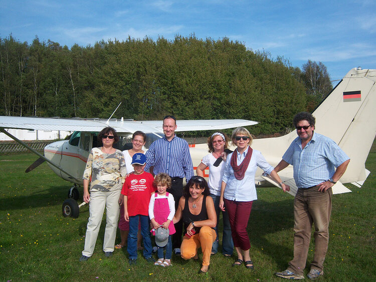 Foto (v.l.n.r.) Frau Wenzel, Frau Hollax, Herr Hollax, Frau Hanke, Frau Bräsecke, Frau Kuckuck und der Pilot Herr Jerkowski