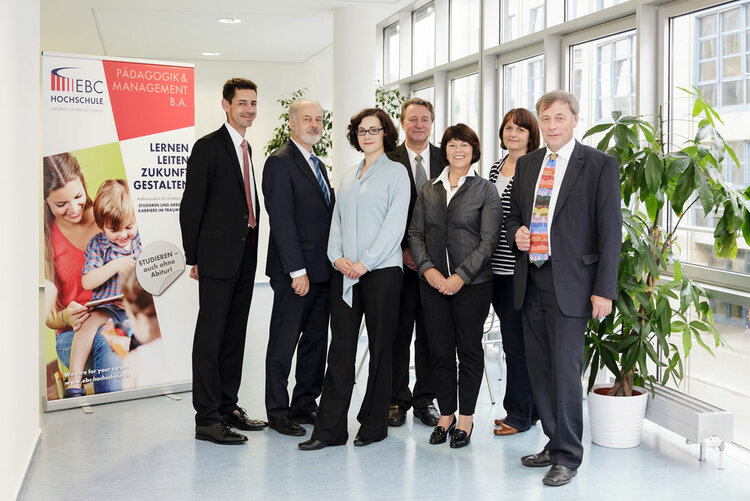 Die Verantwortlichen für den Studiengang "Pädagogik & Management" Präsident Prof. Dr. Uwe Eisermann, Kanzler Johann Stooß, Studiengangsleiterin Prof. Dr. Franziska Stöber, Prof. Dr. Gerd Drechsler, Produktmanagerin Dr. Margit Riße-Göpfert, Anne Töffling - Leiterin der Euro Akademie Leipzig, Bereichsgeschäftsführer Dr. Klaus Drechsel