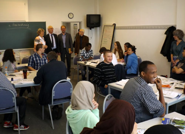Nach einem Rundgang durch das Schulgebäude und Gesprächen mit Teilnehmern aus Integrations- und ESF-BAMF-Sprachkursen wurden bei einem gemeinsamen Imbiss Fragen zur Integration von Flüchtlingen und Asylanten diskutiert.