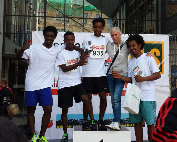 Bereits zum 17. Mal fand der „Dessauer Citylauf“ am Sonntag, den 13. September 2015, statt. Dieses Jahr mit einer Besonderheit: Der „Dessauer Citylauf“ wurde interkulturell. Die Idee, eine eriträische Mannschaft ins Rennen zu schicken, hatten Karola Samoray und Daniela Droth schon direkt nach dem letzten „Firmenlauf“ in Dessau. Hier starteten bereits zwei Läufer aus Eritrea. Ihre flinken Füße bewiesen großes Lauftalent, so dass sie bereits damals ziemlich weit vorn mitliefen.Gesagt, getan: Die Vockeroder Eriträer Awet, Suleiman, Habtit, John und Estifanos starteten am Sonntag als Team „Jobbrücke + Vockerode“. Der Plan ging auf. Nachdem Suleman sogar als zweiter Läufer die Ziellinie überquerte, konnte das gesamte junge Team aus Eritrea den ersten Platz als Mannschaft belegen. Am Ende standen die fünf Jungs überglücklich auf dem Siegertreppchen und nahmen voller Stolz den Pokal entgegen. Nach dem ereignisreichen Tag gab es noch ein spendiertes Eis von Renate Luckmann, was die Strapazen des Laufes vergessen ließ.