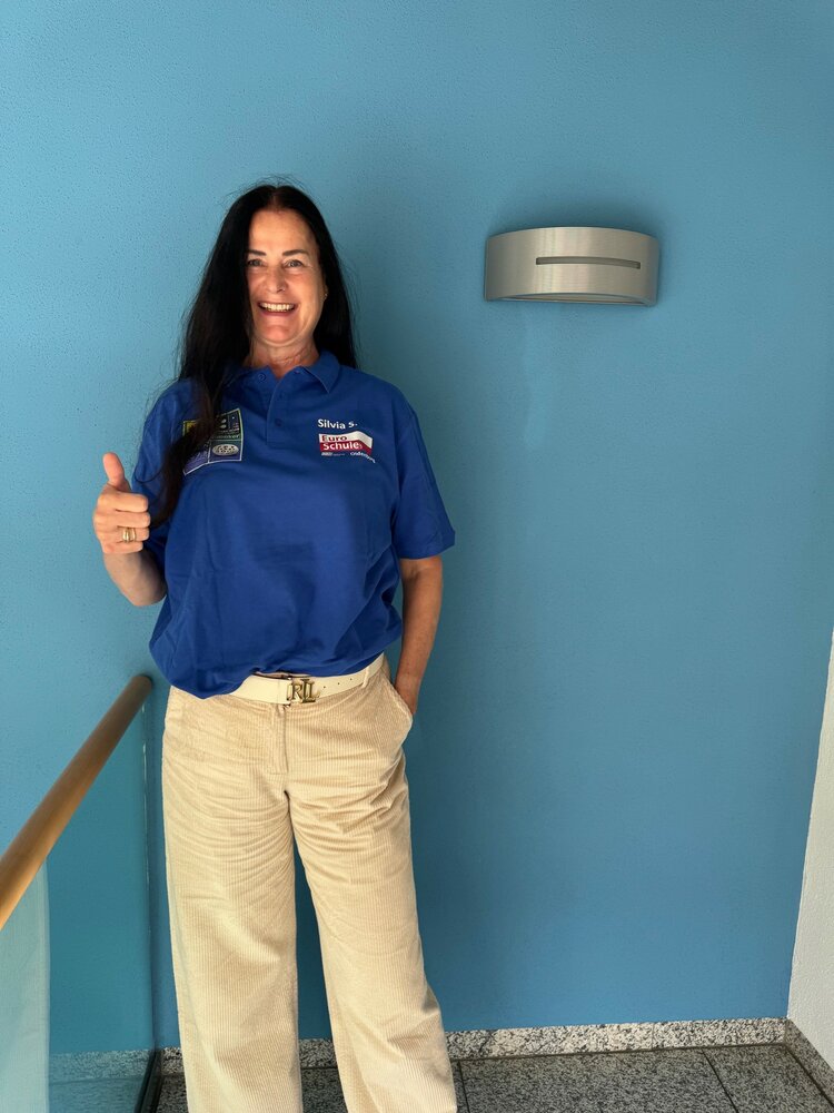 Unsere geschäftsführende Gesellschafterin der Euro-Schulen-Organisation GmbH Silvia Semidei unterstützt das Projekt, indem sie die Trikots der Teilnehmenden sponsert. Sie hat darüber hinaus zugesagt, zu Hause in Stockstadt die Daumen zu drücken. Darum wurde auch sie mit einem entsprechenden Fan-Shirt ausgestattet."